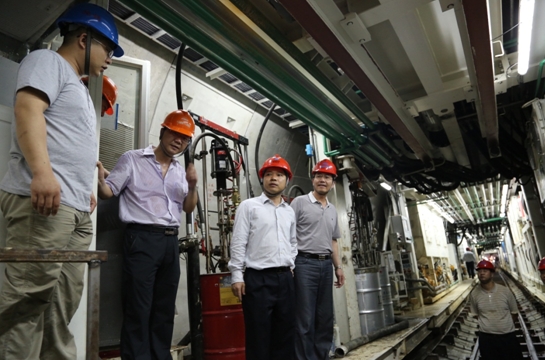 活動當天,黃鐘暉總經(jīng)理首先來到10標盾構(gòu)掘進工地,不顧悶熱一頭鉆進地下盾構(gòu)機掘進通道,一路認真察看、邊走邊向項目負責(zé)人了解工程進展。在盾構(gòu)機操作室,還詳細了解了盾構(gòu)機具體的施工情況、技術(shù)指標等。