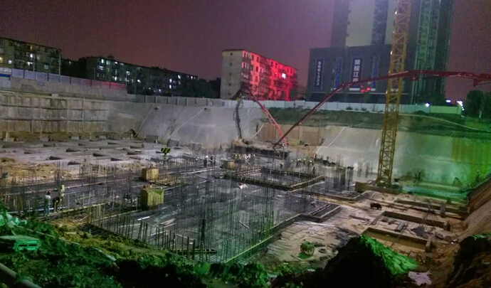 10月26日下午17:20,伴隨著項(xiàng)目全體員工的歡呼聲,最后一車混凝土通過天泵管道順利注入筏板基礎(chǔ)中,至此,經(jīng)過36小時(shí)的持續(xù)鏖戰(zhàn),榮耀江南二期項(xiàng)目1#、2#樓底板第一次大方量混凝土澆筑圓滿完成。