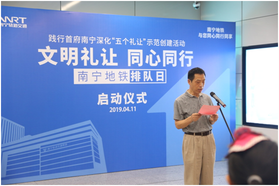 南寧軌道交通集團運營分公司黨委副書記黃滿光在啟動儀式上向廣大市民乘客介紹,2019年每月11日“地鐵排隊日”,南寧地鐵將通過組織志愿者在地鐵車站開展志愿倡導(dǎo)有序排隊活動等多種形式的活動,推動活動常態(tài)化,以點帶面,呼吁廣大市民乘客進入地鐵遵德守禮,自覺排隊乘車、禮讓他人。同時,南寧地鐵也將以“地鐵排隊日”為契機,影響和號召更多的學(xué)校、企事業(yè)等單位加入志愿推廣有序排隊的行列,與各級單位及市民一道共同創(chuàng)建“禮讓之城”。”