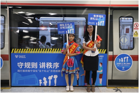 2019年4月11日,南寧地鐵啟動主題為“文明禮讓 同心同行”的南寧地鐵排隊日活動,正式將每月11日確定為“地鐵排隊日”,積極響應(yīng)首府南寧“五個禮讓”示范創(chuàng)建活動,示范和宣傳“有序排隊講禮讓”,提高市民文明排隊、安全文明乘車意識。